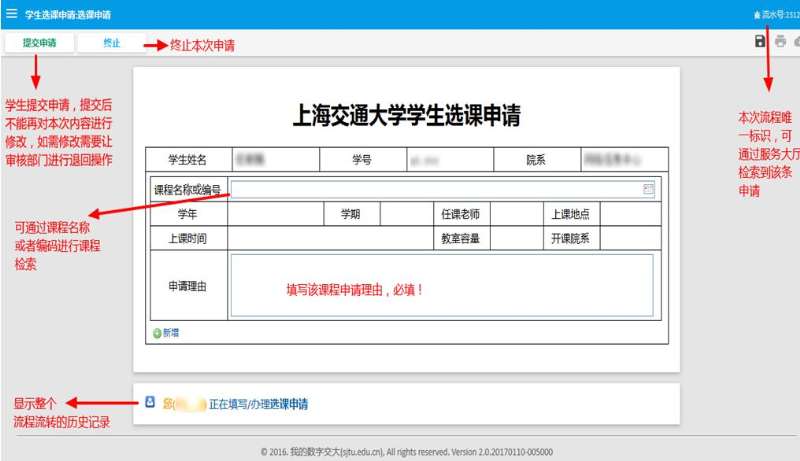 Jaccount登陆之后点击“流程”,查找“学生选课申请”进入申请
