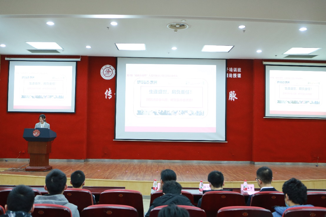 结业典礼在庄严的国歌声中拉开序幕。首先,培训班副班主任毛涵宇对“船旗先锋营”第7期入党积极分子培训班情况进行了总结。他指出,在过去的半个月内,来自4个学院的138名入党积极分子通过本期培训班主题鲜明、内容丰富、形式多样的培训内容,理论素养不断提升,党性修养得到锻炼,入党决心更加坚定。最后,毛涵宇提出寄语,希望各位同学成为中流砥柱,肩负时代赋予我们的责任和使命,挺立大地,做中华的脊梁。