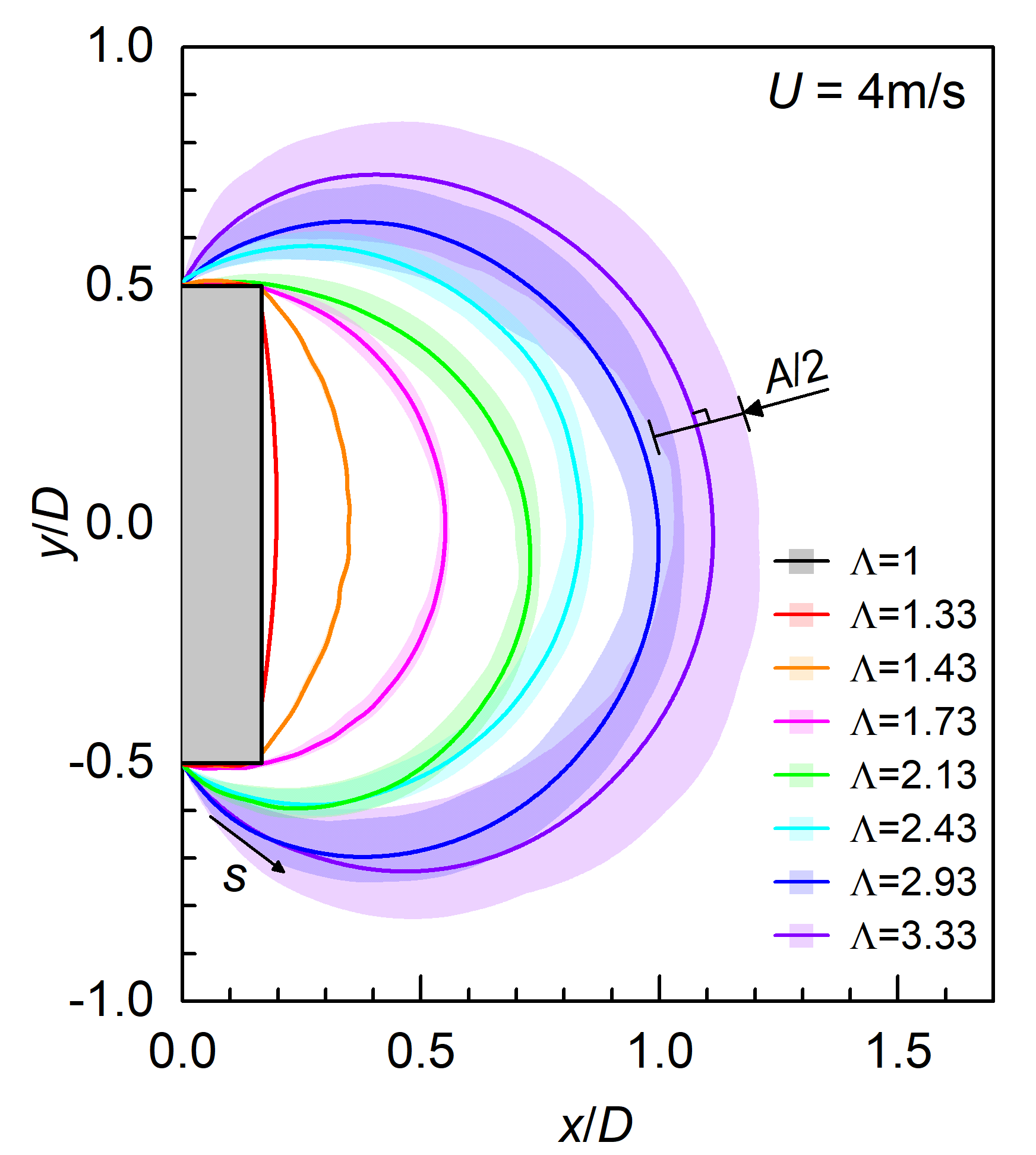图2. 平板所受阻力随薄膜尺寸的变化(左),时间平均的薄膜形状(右)