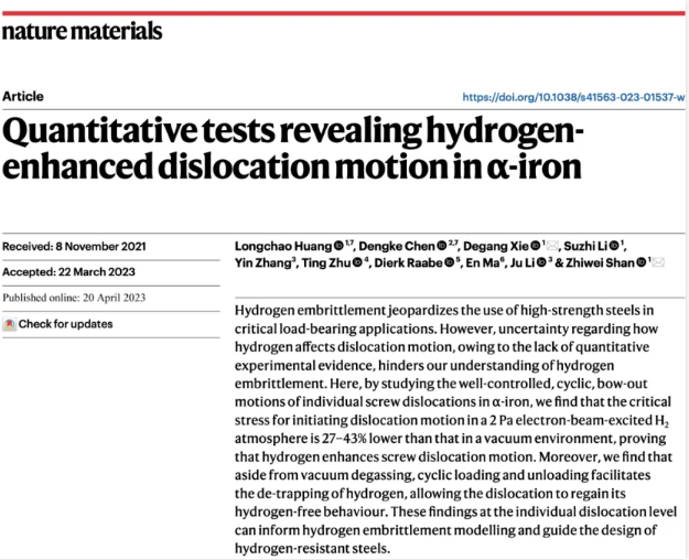2023-06-12近日,《Nature Materials》以“Quantitative tests revealing hydrogen-enhanced dislocation motion in -iron”为题在线发表了澳门十大信誉好的网站长聘教轨副教授陈登科与西安交通大学单智伟教授课题组的合作研究成果,为氢脆机理建模提供了实验依据,为工程上提出抑制氢脆的技术手段提供了理论基础和新的策略。陈登科副教授为论文的共同第一作者,另一位第一作者是单智伟教授课题组黄龙超博士。