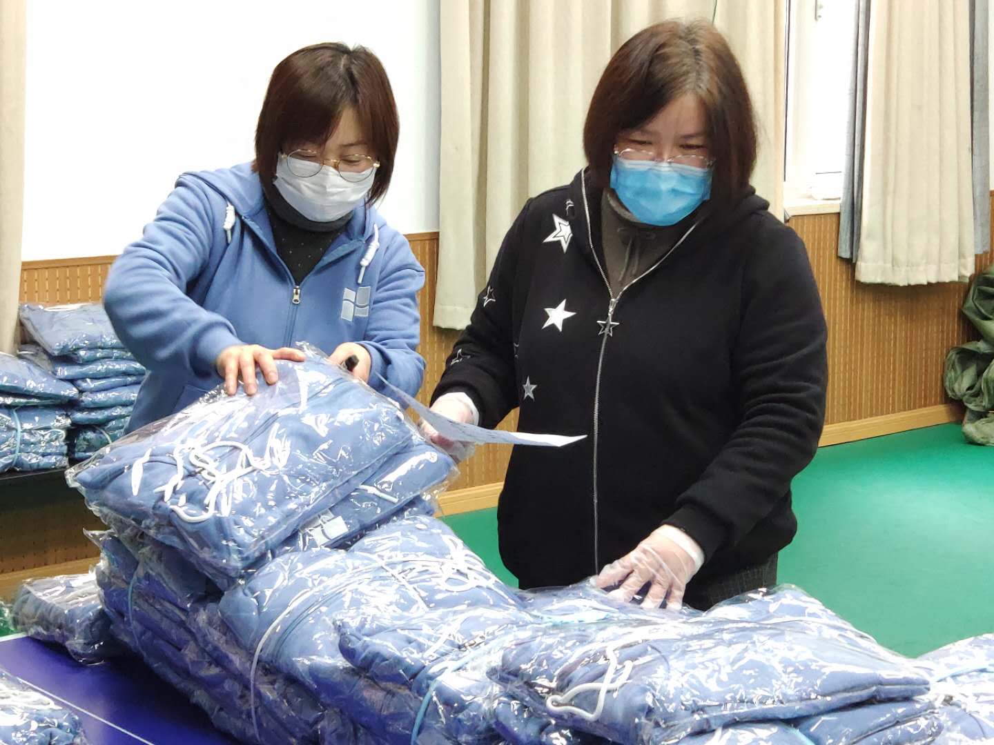 2020-05-25 3月13日上午院工会主席刘铸永、副主席袁敏、生活委员庞红犁根据之前各工会小组上报的院衫统计数据进行按组分拣工作,此项工作得到了行政工会小组长方静、资实办于文凯以及物业的大力支持。