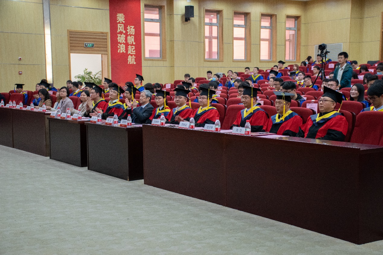 辽宁舰总设计师、中国工程院院士、学院知名院友朱英富学长,学院党委书记周薇,副书记宋续明,副院长杨健,副院长、船舶与海洋工程系系主任薛鸿祥,副院长、工程力学系系主任王本龙,院长助理、船舶与海洋工程系副系主任王鸿东,工会主席、工程力学系副系主任刘铸永,土木工程系系主任陈锦剑,交通运输工程系副系主任杜守继,导师代表、土木工程系教授周岱,研究生教务办主任刘蓉洁,校友工作负责人魏燕,2021届研究生年级思政查芳灵、蒋雨航、史舒婧,以及200余位毕业生出席。仪式由学院党委副书记宋续明主持。