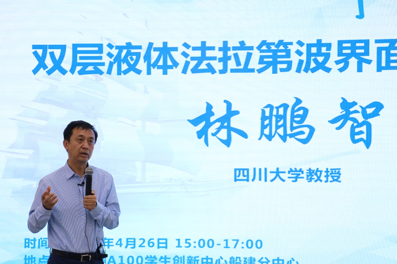 4月26日下午,四川大学林鹏智教授来到上海交大船建学院,做客第三期“旭华讲坛”,为船建师生作题为“双层液体法拉第波界面失稳研究”的报告。院长廖世俊出席,副院长王本龙主持会议,学院内外80余名师生参与了本场讲坛。