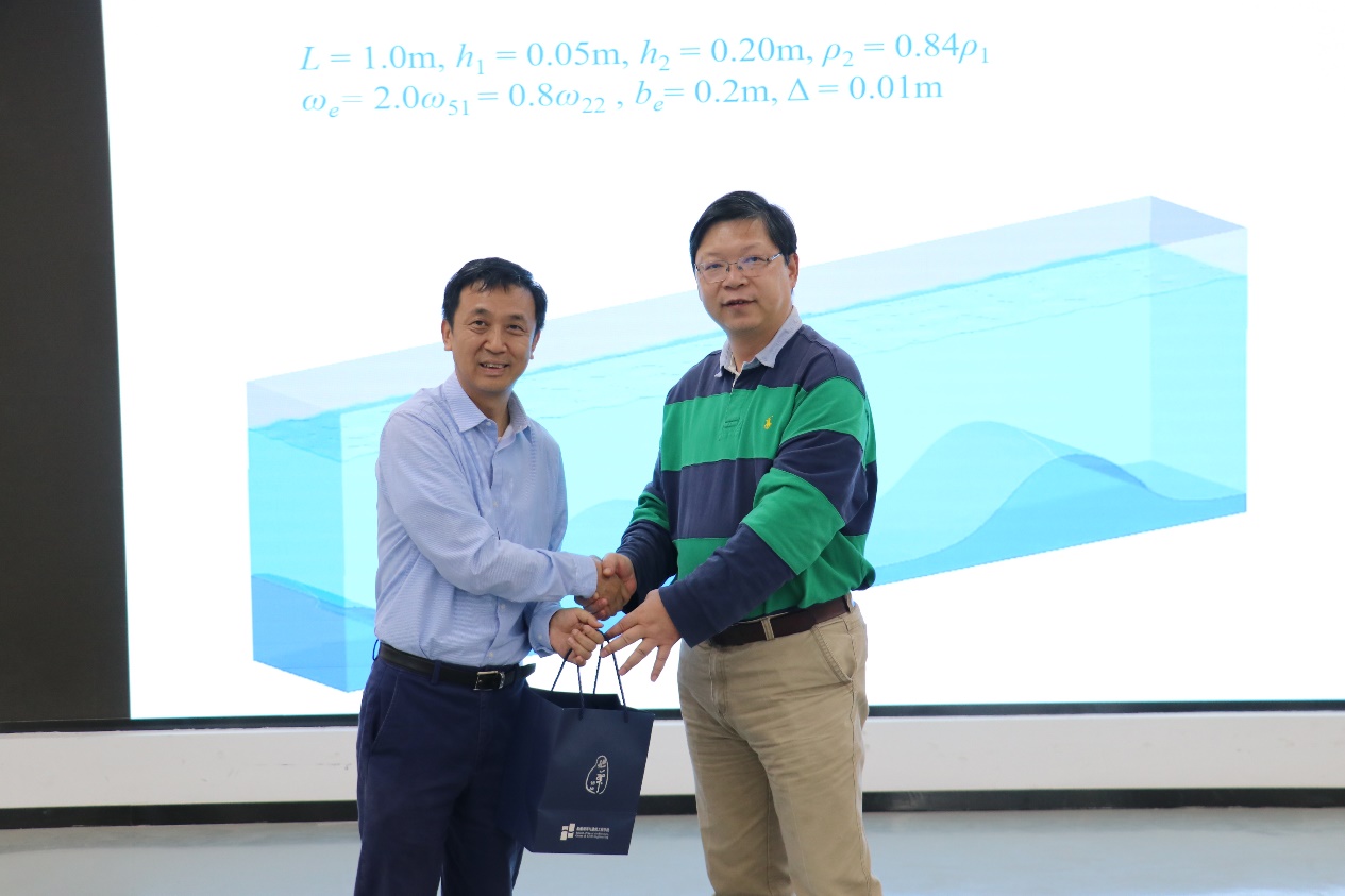 林鹏智教授首先介绍了液体晃荡问题的研究背景和意义,指出液体晃荡作为一个复杂的数学物理问题,由于其广泛的工程背景而被普遍关注,研究成果在浮式生产储油外输装置(FPSO)、海洋工程结构物防摇——分层流体TLD减振装置等方面做了推广应用。随后针对含自由表面的双层液体系统,分别从晃荡问题的理论解析、晃荡问题的试验设置、NEWTANK三维数值水池和不同外激励下双层液体共振晃荡与界面失稳等方面开展了介绍。
