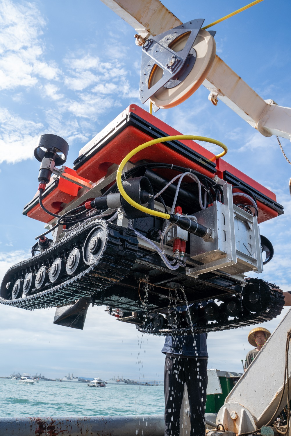 此次海试过程中,“海洋守护者”多次完成了布放回收、水中定深巡航、海底履带行走、水下废弃物搜索和水力收集等一系列试验内容,克服浑浊水质条件下的水下极低能见度,对浅埋于海底的塑料矿泉水瓶等废弃物进行了成功搜寻和回收清理,机器人矢量推进、履带行走、废弃物收集、水下环境感知和电气实时控制等各子系统功能运行正常,作业性能达到预期设计目标。