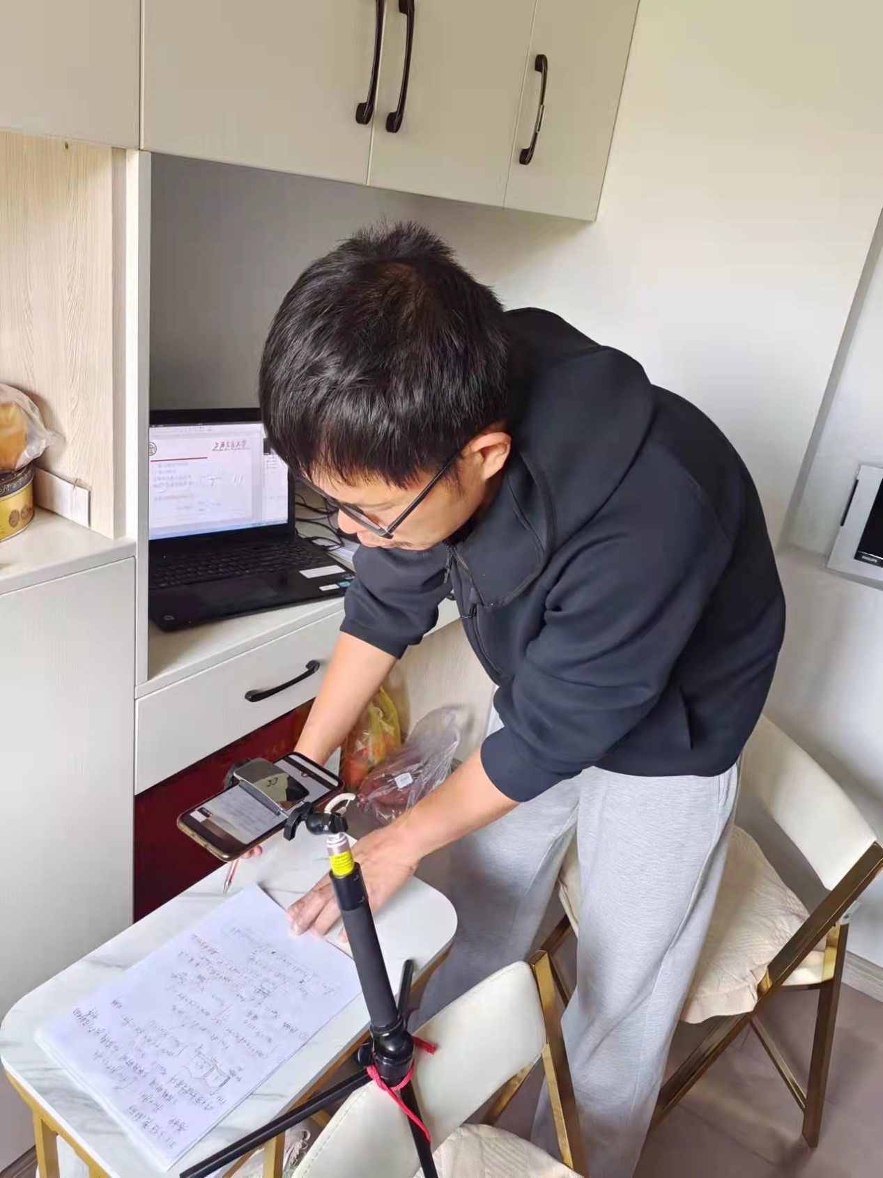 李四平老师、王淼老师是目前在校进行封闭管理的31位老师中的一员,他们分别承担《理论力学》和《材料力学》这两门面向全校开班的公共基础课。面对量大面广的授课群体,老师不仅要关注学生不同程度的理论基础,还要时刻掌握学生对知识点的理解程度。李四平老师表示,《理论力学》学时紧、内容多,为了更好让同学们掌握讲课内容,在线教学着重了对例题的讲解,同时安排了课后作业帮助同学们回顾课程内容。王淼老师表示,闭环管理的当天由于是第一节的早课,他7点10分就来到学校进行课前准备,收到通知后就在一个人的教室开展在线教学工作。由于自己是第一次采用在线教学的模式,他报名参加了教务处组织的在线教学培训,并对课程板书及理论讲解模式等不断进行优化。作为在校教师,李四平和王淼都第一时间主动报名加入了“送餐天团”,每天为近3500名在校学生运送一日三餐。在一次送餐路上,他们被教学班的学生认出,在收到隔空感谢的时候,他们更加坚定了教书育人的初心。