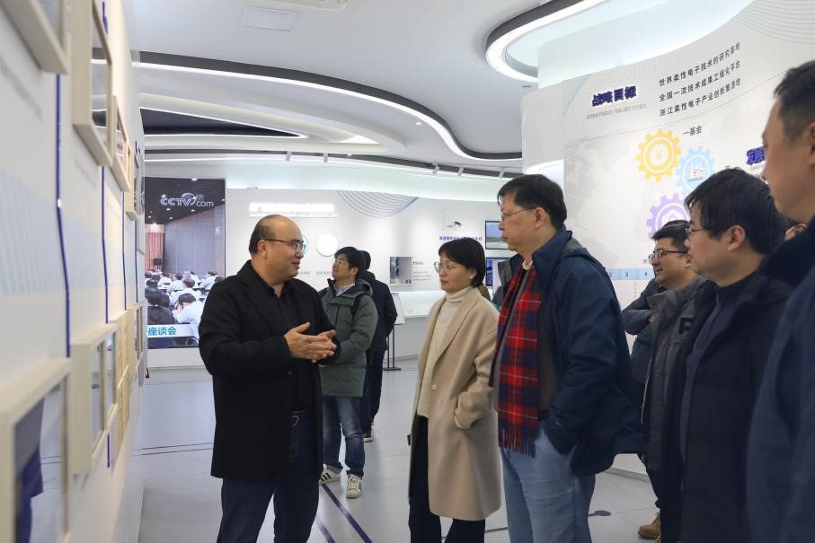 参观调研期间,马少鹏教授带领大家实地参观了浙江清华柔性电子技术研究院科技展示馆及柔性封装小试线,并对柔电院在科研创新、平台建设以及成果应用,尤其是柔性电子技术融入国家战略科技力量建设的成效进行了讲解与展示。