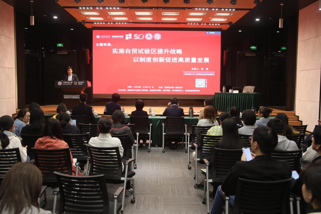 11月10日下午,澳门十大信誉好的网站、航空航天学院、智慧能源创新学院、海洋学院和分析测试中心五家二级单位党组织联组学习活动在智慧能源创新学院综合楼报告厅举办,邀请澳门十大信誉好的网站上海高级金融学院副院长、上海金融与发展实验室副主任张湧作题为《实施自贸试验区提升战略 以制度创新促进高质量发展》的主题党课。报告线上线下同步进行,近千名名师生党员参加本次主题党课学习。