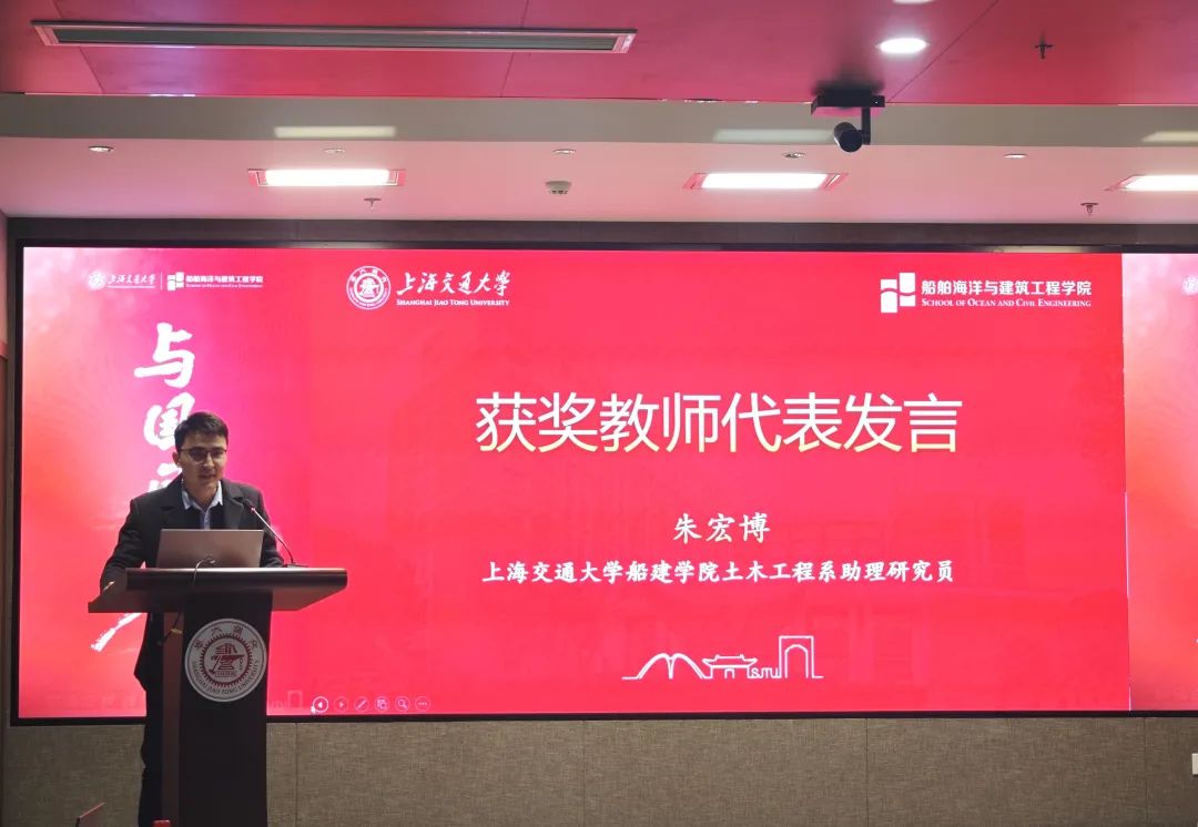 船建学院土木工程系朱宏博老师作为获奖教师代表发言,表达了对黄金枝教育发展基金会和学校的感激之情,表示黄金枝土木建筑奖研金为自身科研工作提供了关键支持与精神鼓舞。