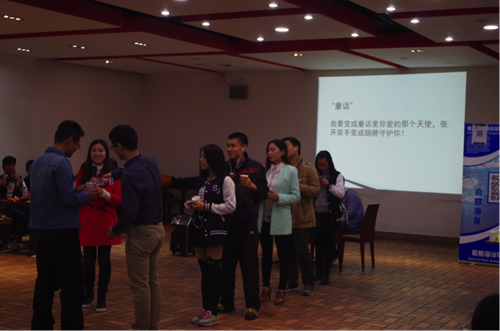 晚上七点,伴随着主持人对晚会的活动介绍,联欢晚会正式开始。参与活动的小伙伴根据入场时抽取明信片的编号,被随机分成四个小组,开始了激烈有趣的竞技游戏比拼。第一个游戏是“含水传歌”,每组派出6名成员,由队尾一名同学嘴里含水对前一名同学唱出歌词,并依次由后一名同学将歌词传递给前一名同学。最后由队首同学唱出歌词,答对者得分。不仅需要游戏者在含水的情况下“唱出”歌词,更需要通过面部表情传递更多的信息,帮助同伴猜对歌词,需要组内成员之间具有很好地默契度。