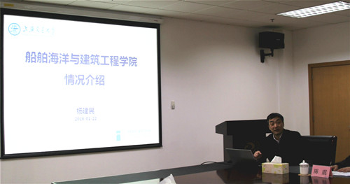 杨建民向来访者详细介绍了船建学院概况,尤其是船舶与海洋工程学科的发展情况。学院船舶与海洋工程学科是国家一级重点学科,培养了一大批船舶与海洋工程领域领军人才,在国内船海领域创造了多个“第一”。近年来,学院开展大量船舶与海洋工程创新性、前瞻性科研,在基础研究、船舶工程、海洋工程、水下工程、国防建设等方面实现重大突破,积极推动船舶与海洋工程国家实验室、高新船舶与深海开发装备协同创新中心、中国海洋装备战略研究院等一系列基地建设。此外,学院在加强船海学科引领性建设的同时,积极推动船海学科与建筑、土木等学科的有机结合,实现学科的交叉与融合,促进学院发展。
