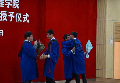伴着激昂的音乐,2016届硕士毕业生学位授予仪式正式开始。张卫刚、杨建民、赵金城与各系主任一起,分别为五个专业的学生颁发了学位证书。全体毕业生依次上台,接受学位并与导师合影留念。