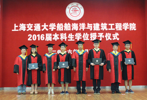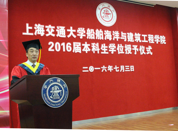 7月3日下午,船建学院2016届本科毕业生学位授予仪式在闵行校区木兰船建大楼A200报告厅举行。船建学院党委书记张卫刚、院长杨建民、学院党委副书记杨建军、副院长兼工程力学系主任乔丕忠、副院长夏利娟、船舶与海洋工程系副系主任陈俐,土木工程系主任沈水龙、建筑学系主任黄建云、国际航运系副系主任孙健,以及全体2015届本科毕业生及部分学生家长出席了授予仪式。