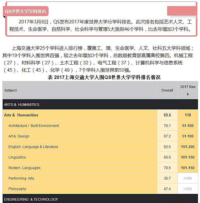目前世界教育学科最具影响力的四大排名系统排名第二的QS世界大学排名(Quacquarelli Symonds)发布的“2017年世界大学学科排名”公报显示:澳门十大信誉好的网站人文领域建筑学科排名已经来到了第51~100位,在上海交大入榜的人文、工科、理科、社科、生医五大领域26个学科当中,依前50/100/150/200四个档位当中隶属第二档(共12个学科),排名前列。而在国内同专业QS排名当中则高据第三位,仅次于清华、同济建筑系,名列前茅。
