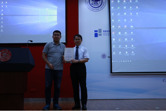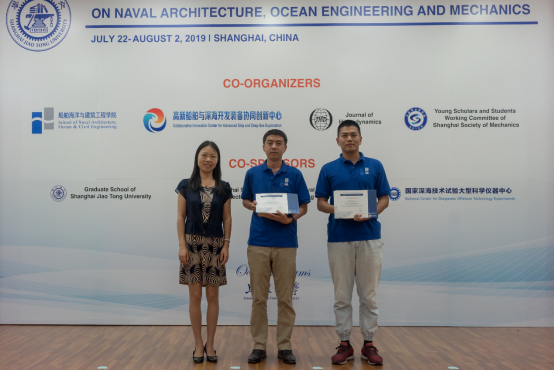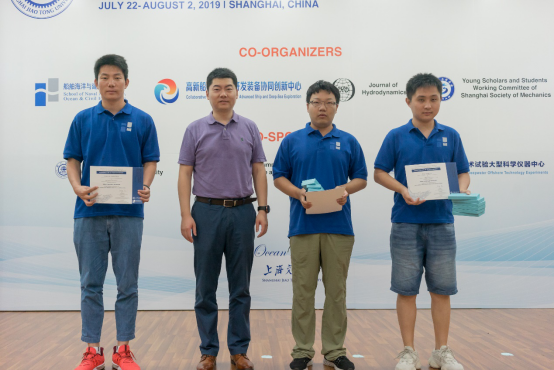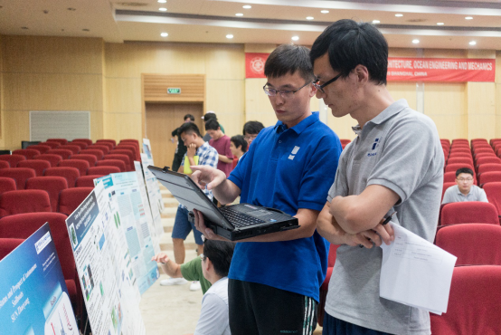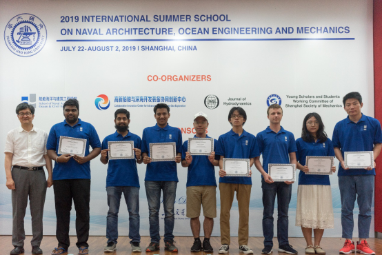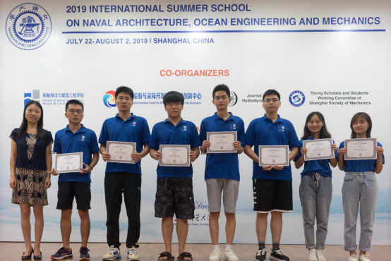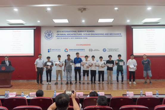 除了聆听专家学者授课之外,暑期学校还安排了学生学术海报展示评比交流平台。来自国内外高校的30名研究生,将自己研究领域的相关学术成果,精心制作成海报,依次陈列在木兰楼一楼大厅,引得不少专家教授和往来同学的驻足阅览。7月25日下午,上海交大船建学院顾解忡、刘亚东、孟帅、程正顺、张显涛、崔进举五位专家老师担任评委,一一听取了同学们的海报陈述,并与同学们展开零距离的交流探讨,对每一幅海报作品进行了打分评比。根据规则评选出一等奖(Outstanding Winners )3名,二等奖(Meritorious Winners)5名和三等奖(Honorable Mention)10名,并现场举行了颁奖仪式。
