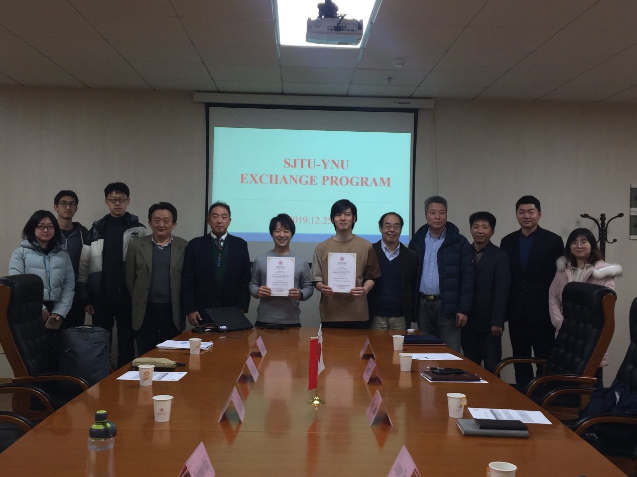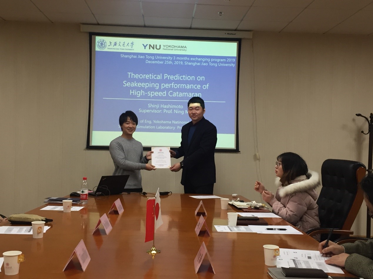 12月26日2019年度SJTU-YNU Joint Workshop暨日本横滨国立大学短期(三个月)交流交换生结业典礼在木兰船建大楼A1008会议室举行,船建学院导师代表马宁老师、陈作钢老师、余龙老师、顾解忡老师和学工办史舒婧老师,学院船海系、土木系部分学生代表出席结业典礼,横滨国立大学(YNU)的Takanori Hino和Motohiko Murai两位教授专程前来参加结业典礼和学生答辩。