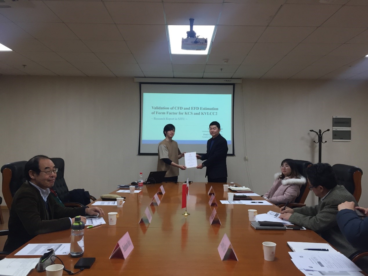 出席Workshop的师生们对两名交流生的发表内容进行了热烈讨论,参会的教师们还对交流生今后的研究方向进行了指点。两名交流生表示,通过这次交流,他们不仅在科研上得到了启迪和长进,也收获了与船建学院研究生的友情,增进了对中国文化的理解。报告会结束后,余龙老师为两名日本交流生颁发了结业证书并表示祝贺。