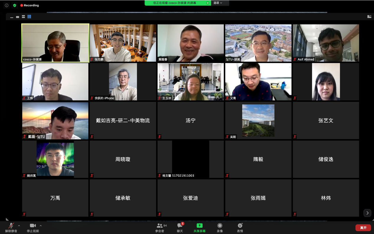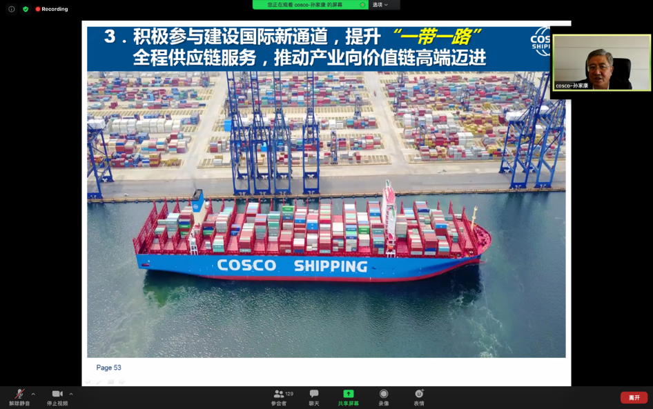 8月25日,船建学院交通运输工程系举办了“天地交通·云端讲堂”第四期在线学术讲座。本次在线学术讲座邀请了上海市政协经济委员会副主任委员,中国远洋海运集团原党组副书记、董事孙家康先生主讲。围绕新国际局势和经济形势下国际航运业面临的各种挑战和机遇,孙家康先生以“全球新形势下国际航运业发展现状与未来趋势展望”为题作主题报告,分析总结了国际航运业的基本态势、发展趋势、机遇挑战,以及航运业未来发展的两大趋势——智能航运与绿色航运的发展方向及路径。此次学术讲座共吸引了140多位交大师生线上参与,由船建学院黄醒春教授主持。
