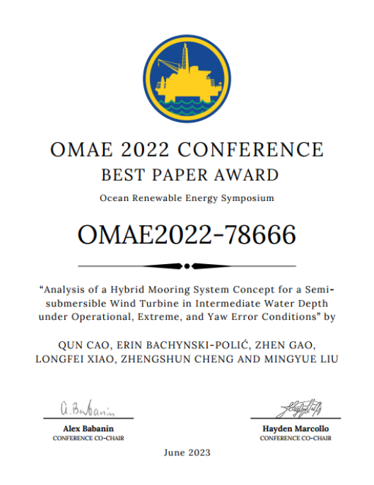 船建学子荣获第41届Ocean, Offshore and Arctic Engineering (OMAE)国际会议最佳论文奖
