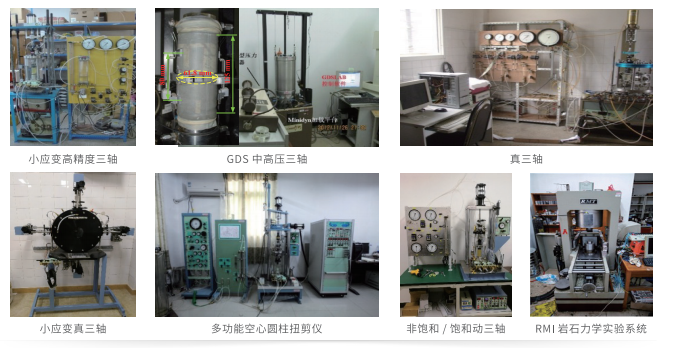 实验室自主研发了高精度三轴仪、真三轴仪、空心圆柱扭剪仪等近10台/套先进土工试验设备,能开展复杂应力路径、多场耦合条件下的高精尖岩土体单元试验。室内物理模拟试验槽尺寸为2m*1.5m*1.5m,配有电动伺服作动器3台,可开展小比例1g模型试验。结合可完成ng重力场模型试验的鼓式离心机,具备开展不同尺度岩土工程模型试验的能力。