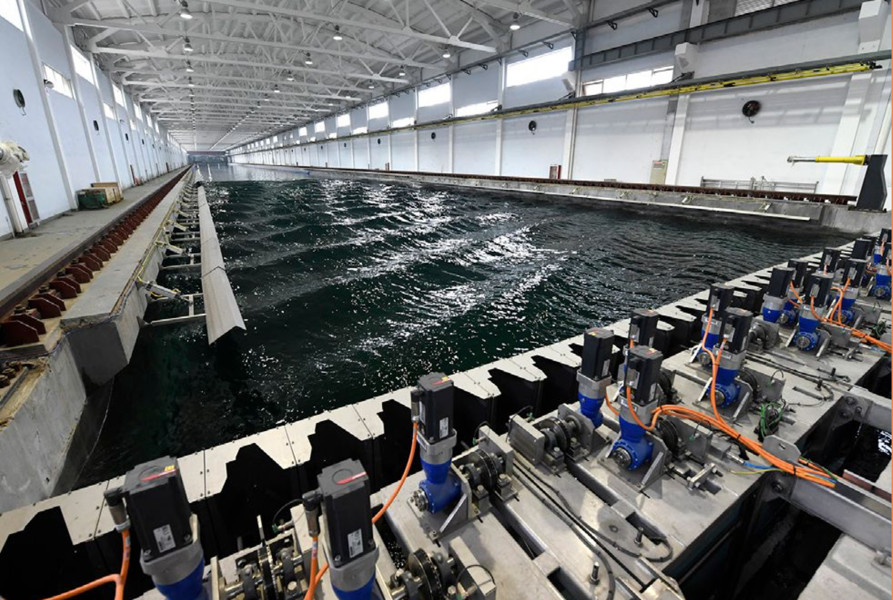 主尺度为 300 米 ×16 米 ×7.5 米。拖车最大速度 10 米 / 秒。多单元造波系统可生成各类标准随机波及自 定义波谱。可进行船舶与海洋结构物在静水中或波浪 中水动力学问题,以及可再生能源、力学、海洋科学、 水下工程等领域的实验研究。
